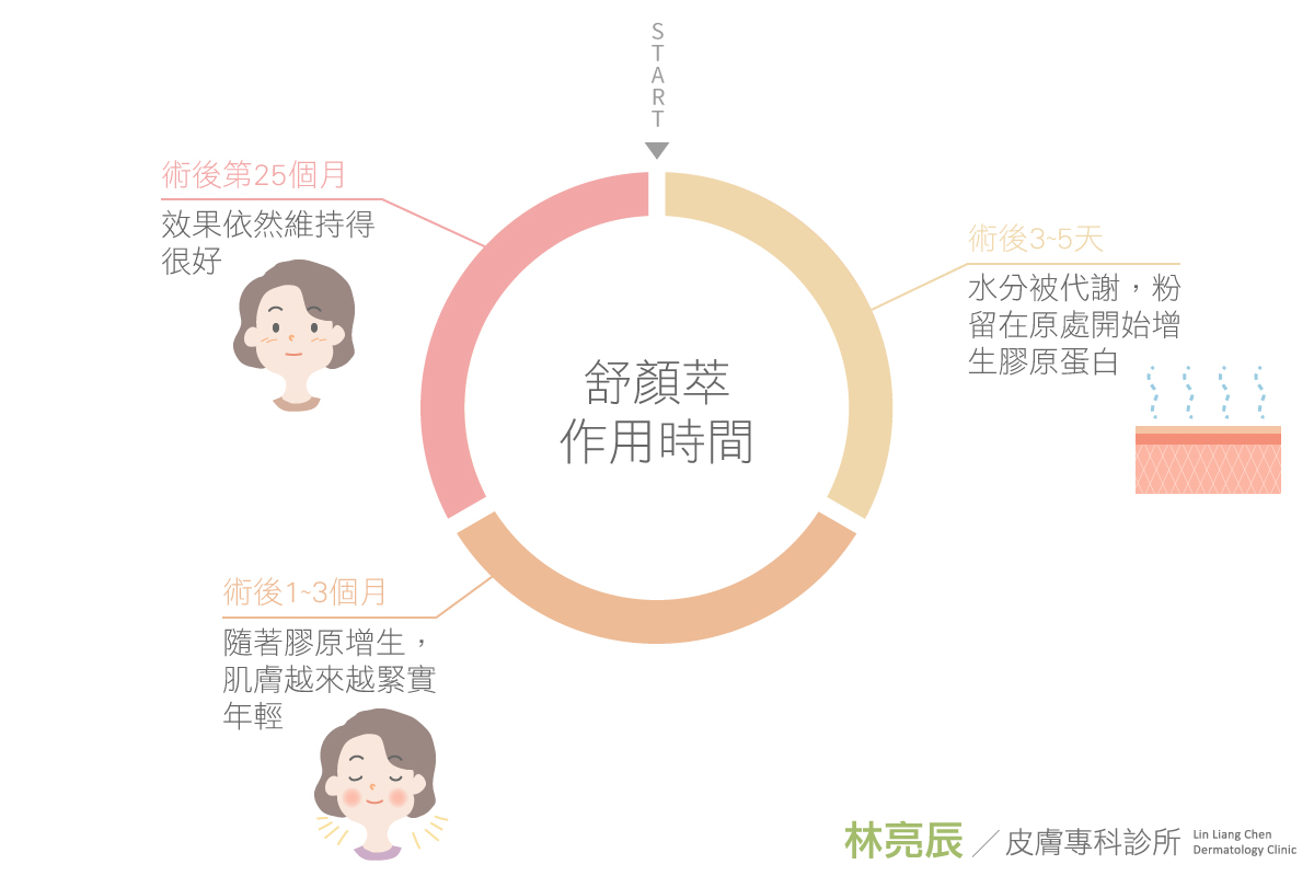 舒顏萃(3D聚左旋乳酸)需要透過計畫性地治療,分為三個階段,分別為打底、塑形、定型,透過打底重建骨架,重新建立年輕的輪廓框架,第二階段塑形補充中層的軟組織修飾線條,最後再做淺層修補精雕細琢,由深層到淺層大約需要半年時間。