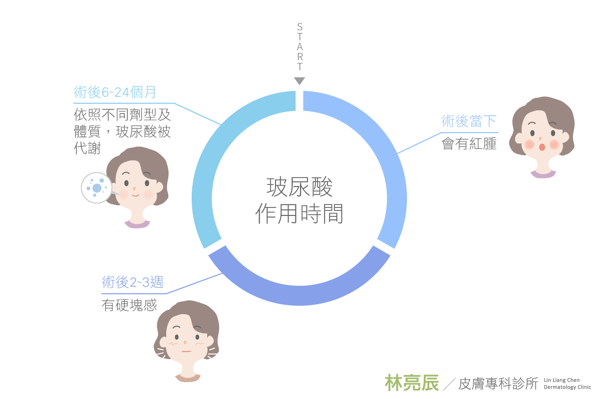 顆粒型玻尿酸是以分子大小區分,分子較大的玻尿酸有較好的支撐力,適合用在輪廓塑型,維持時間大約9個月至1年;分子較小的玻尿酸則是適合用於淺層,在修飾細紋方面效果好,維持時間大約6個月。凝膠型玻尿酸是以交聯程度區分,交聯程度越高維持時間越久,最久可維持大約18個月至2年,而交聯程度低的大約維持9個月就會被身體代謝。
