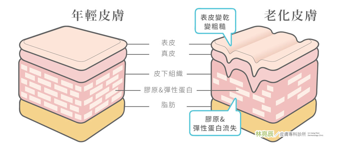 日曬及老化會造成真皮層的膠原蛋白、彈力蛋白迅速的流失,拉扯到真皮層,就會在眼下、嘴角形成討人厭的細紋。內因性老化及隨著年紀漸長,纖維母細胞減少分裂增生,使真皮層中膠原纖維蛋白、彈力纖維蛋白和玻尿酸含量降低;而光老化是由於紫外線對於肌膚的損傷,長時間不防曬,導致膠原蛋白纖維排列序亂,導致細紋、皺紋、粗糙、斑點、色素沉澱等。這也是為什麼皮膚科醫師非常重視防曬手續。