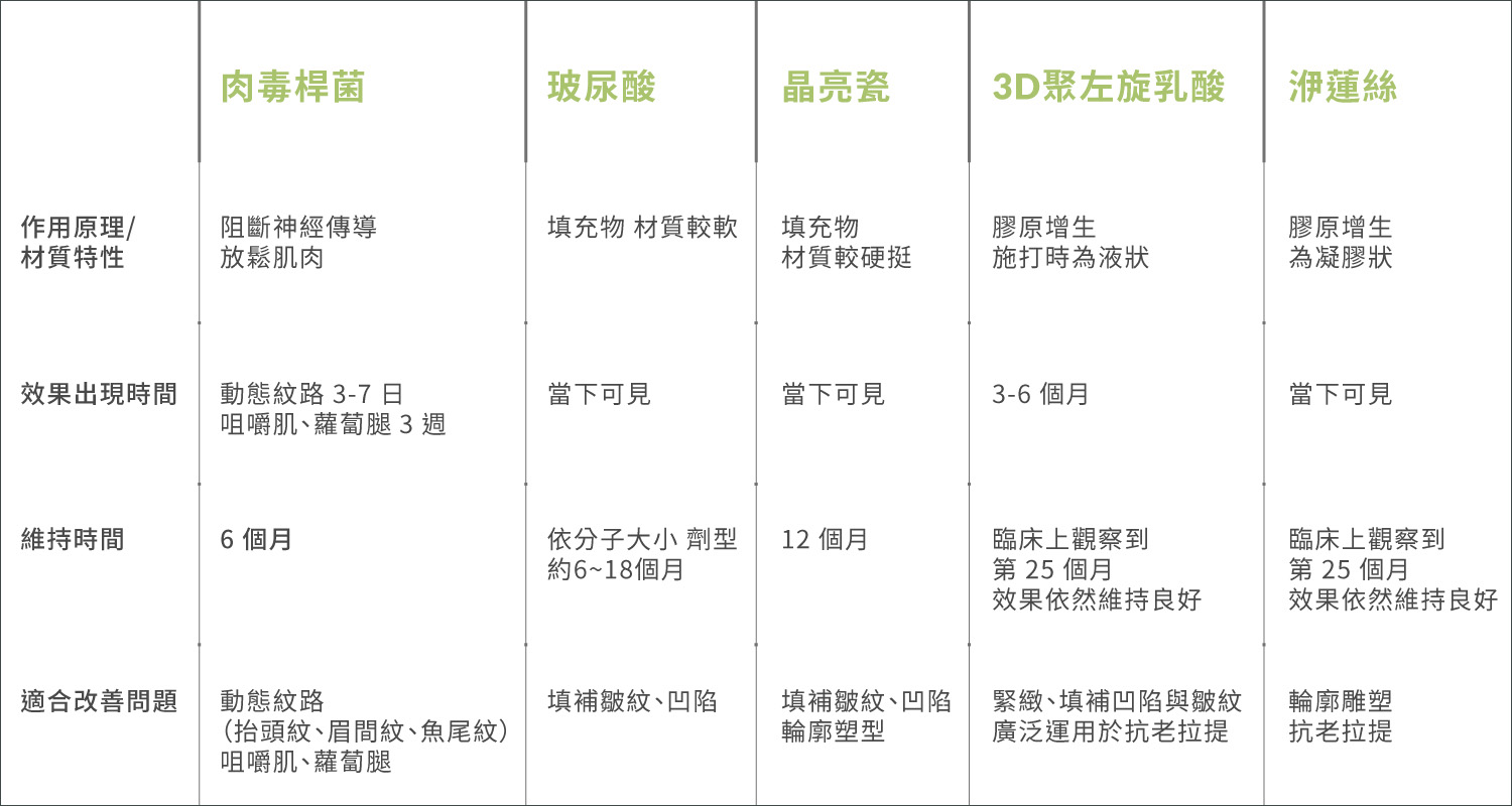 以下統整了簡單的表格,將台灣目前較常被運用在微整形(輪廓塑型、抗老拉提)的特性簡單整理。