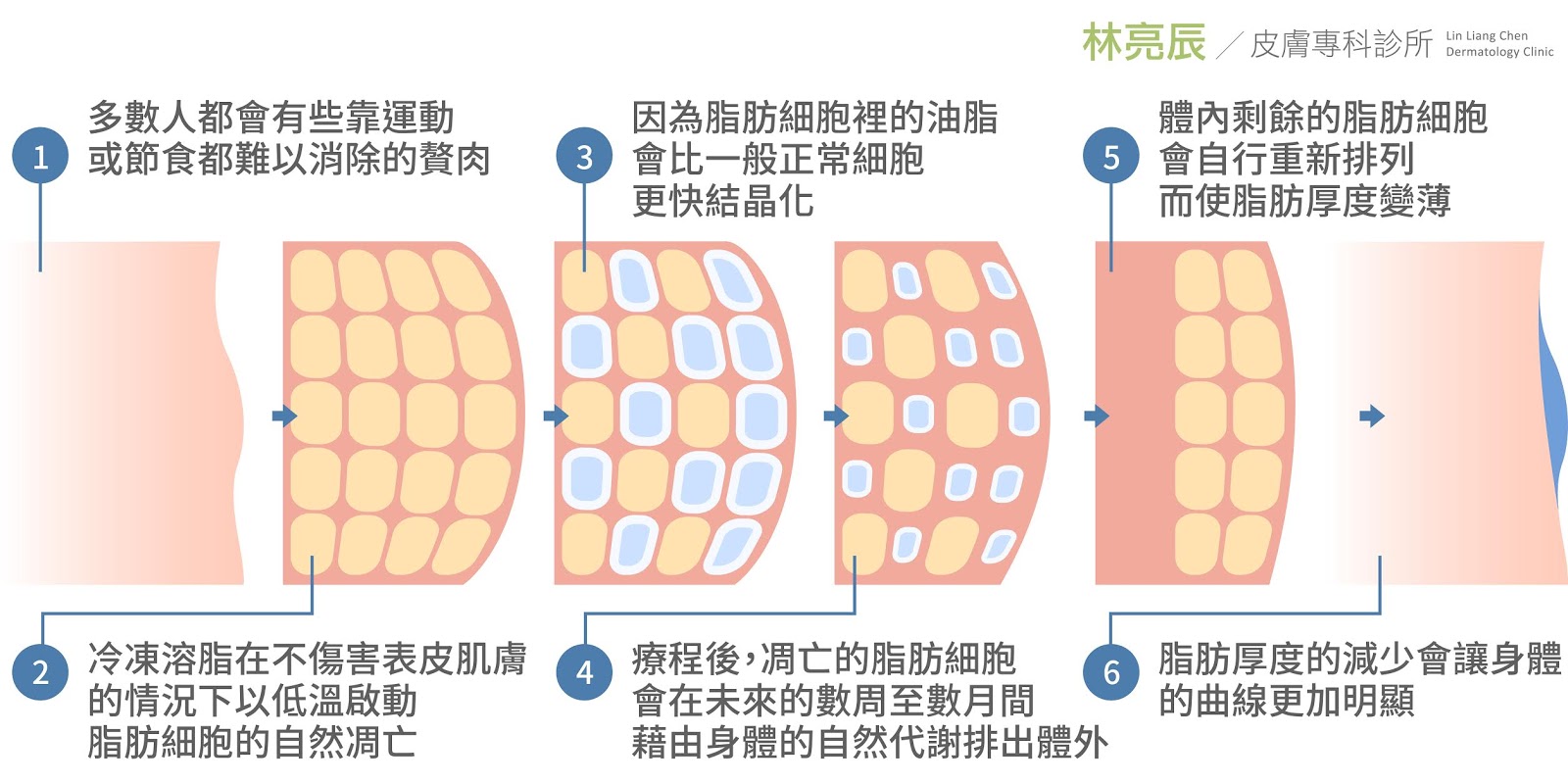 不過值得開心的是,隨著科技的進步發達,體雕療程不斷的進步更新,尤其CoolSculpting冷凍溶脂,利用脂肪細胞不耐冷的特性,採用低溫技術,能夠在不傷害肌膚及其他組織的情況下,鎖定脂肪,使脂肪細胞結晶萎靡化,讓脂肪細胞自然的凋亡後再由人體的代謝系統使其排出體外,有效的減去脂肪,達到減脂塑身的效果,且和傳統抽脂相比,過程安全舒適無傷口,更不影響生活作息,術後照顧簡單,免穿塑身衣,正因上述種種優勢、特點,冷凍溶脂在上市短短幾個月即造成轟動,受到大家歡迎。