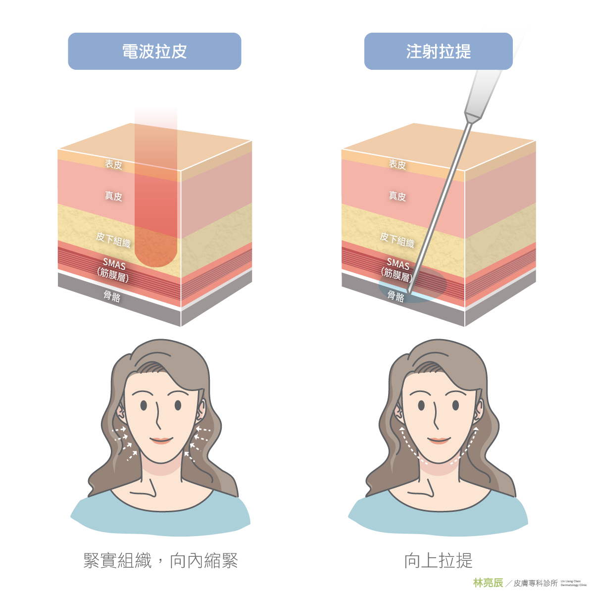 一般人以為的「拉提(Lifting)」,則是組織向上提升,將下墜的組織上提,因此若有人以為透過電波拉皮就可以把下垂的臉頰、蘋果肌等組織網上提,那麼當然會覺得效果不好!