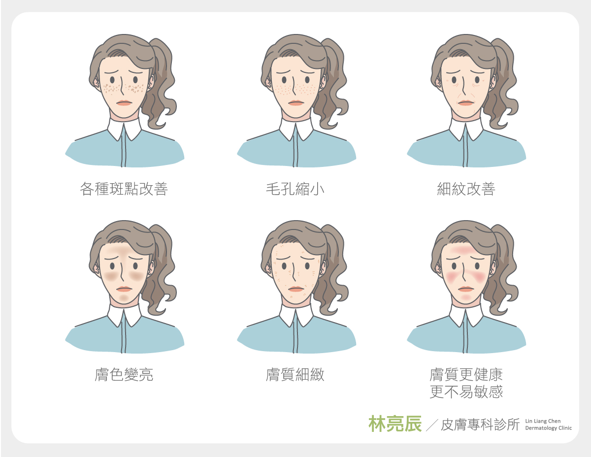 許多人在治療後表示:「施作完的第一二個月,膚質會達到巔峰的狀態」。真實的體感除了「皮膚問題改善」,如各種斑點、毛孔、細紋等,明顯感受到膚色變亮、膚色不勻暗沈改善,膚質整體更為細緻。更令女性青睞的點則是「素顏皮膚很亮,上妝妝感貼」,近距離看都覺得細緻、有質感和光澤。