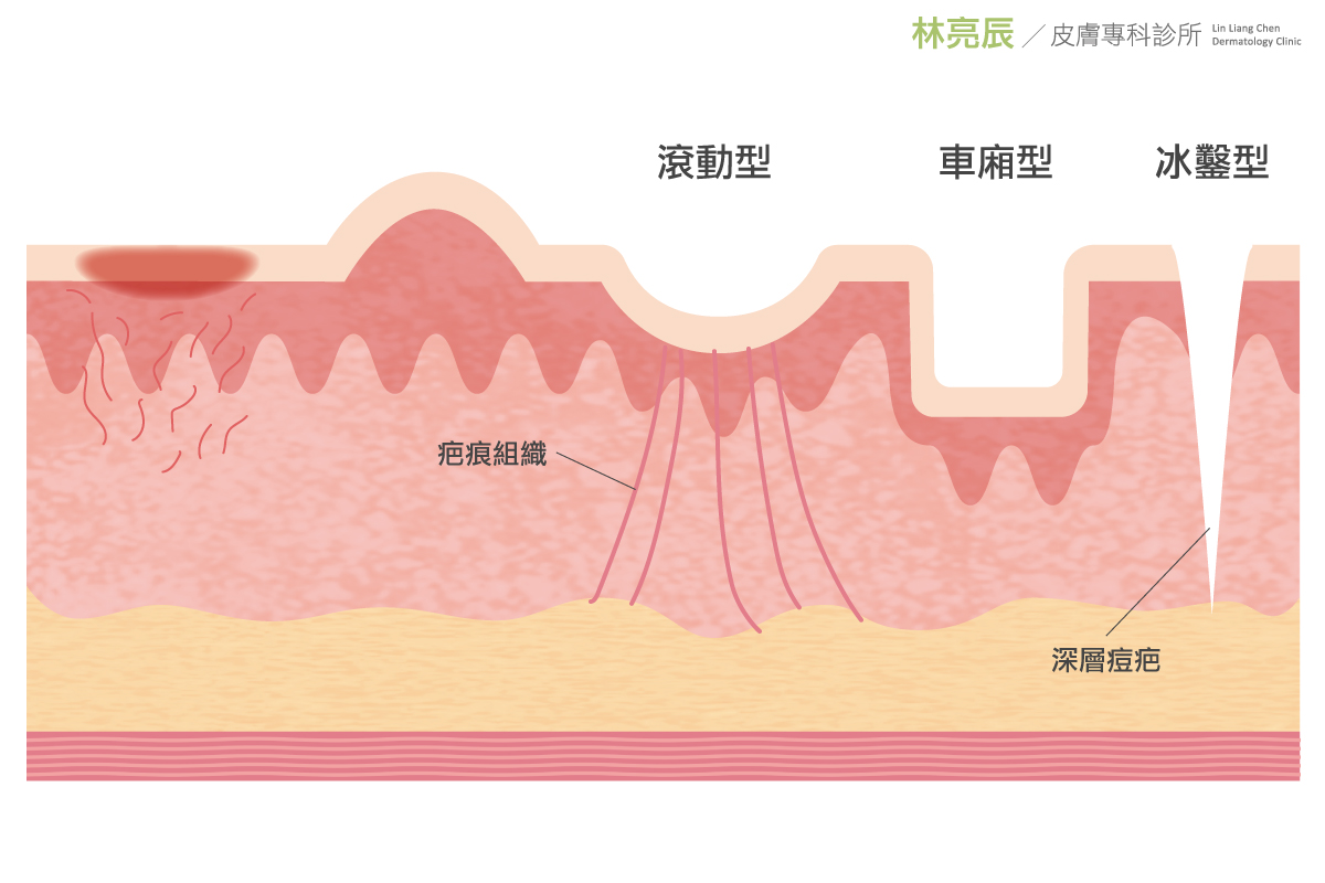除了凹疤,還有一個關鍵,那正是「痘痘嚴重發炎,而在皮膚進行修復的過程中,發生纖維化與體積的流失,造成組織損壞,破壞了原本平衡的正常結構,皮膚的表面受到纖維束狀組織(fibrous bands)向下拉扯的疤痕組織」,觸覺上會覺得凹疤肌膚硬硬、粗粗的。
