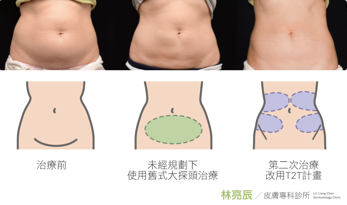 像是冷凍溶脂雖然每次治療能夠減少該部位22.4%的脂肪,但整體曲線、脂肪團塊的分佈、體態比例也都必須納入考量,小腹凹下去、平了不會感覺特別好看,但假如針對上下腹外側、穿牛仔褲特別容易擠出肉的後腰等加強雕塑,優化整體身形,就能達到求診者所期待的,有曲線、自然卻性感、更有自信的樣貌,這也就是T2T(Treat-to-Target)的治療概念。