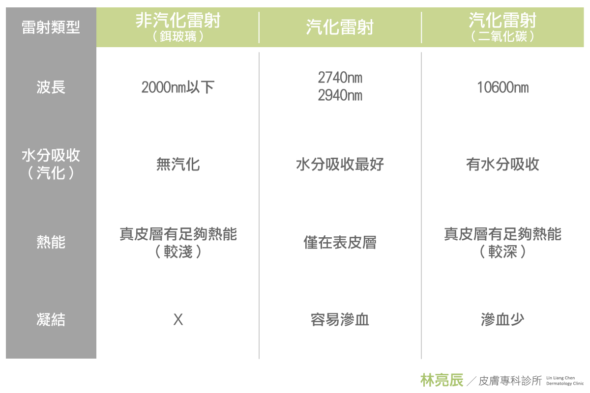 非汽化雷射,雖然沒有傷口,但也無法移除不正常的疤痕組織,因此對於痘疤凹洞無法改善;汽化雷射,以高溫將皮膚內水分汽化,能有效移除疤痕組織,並刺激膠原蛋白新生,讓凹洞回復平整。
