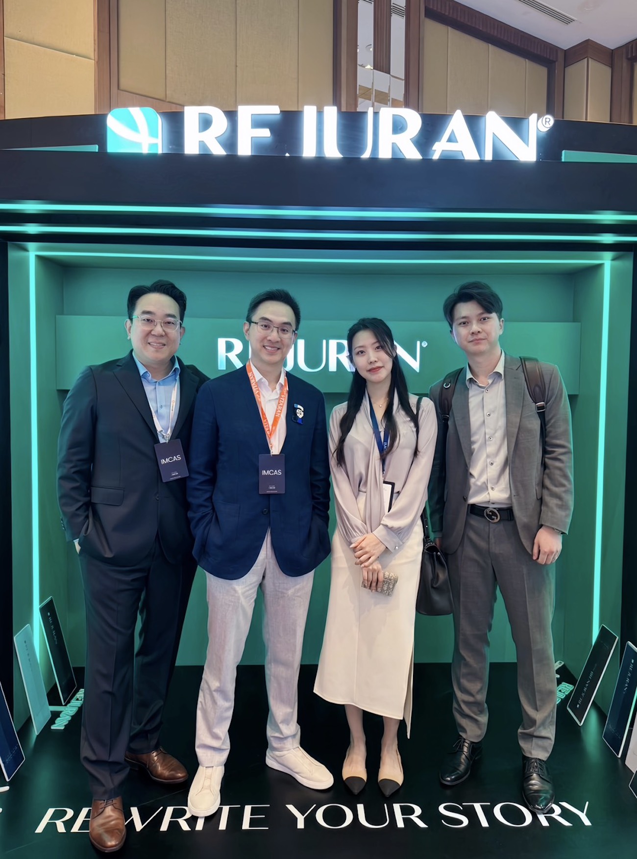 林亮辰醫師於 2025 IMCAS 曼谷大會期間,於麗珠蘭(Rejuran)攤位合影。麗珠蘭PDRN作為診所長期推廣的皮膚健康療程核心材料之一,結合無限電波,持續優化膚質重建效果,獲得臨床高度肯定。