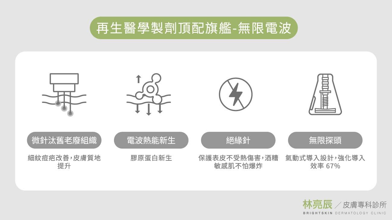 透過絕緣針到達目標層次後,於特定深度釋放電波加熱,可更精準地作用並產生熱凝結反應,刺激深層的膠原蛋白新生與彈力纖維重建,緊實皮膚與拉提輪廓,不必像過去電波拉皮的全層加熱,可能活化表皮黑色素,並為肝斑/酒糟族群帶來膚況惡化的風險,無限電波直接作用於真皮層的效果確實、反黑機率也更低