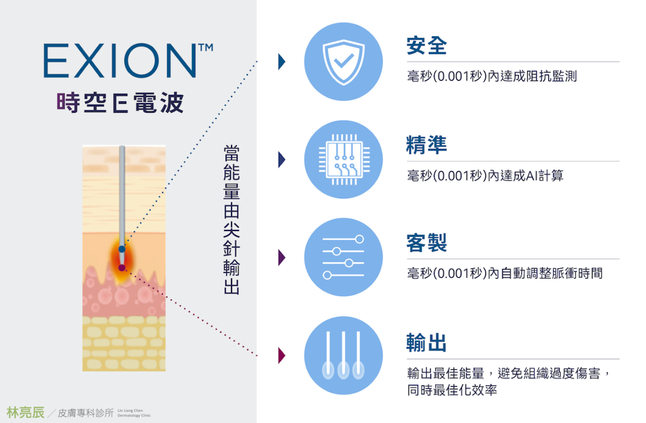 時空E電波具備專利AI智能系統,可即時監控肌膚狀態,在毫秒(0.001秒)內自動偵測治療區域的皮膚阻抗,隨時調整參數,精確地調節微針深度與能量,根據不同部位的皮膚特性進行個性化調整,掌控能量輸出,在確保效果之外,也能有效降低副作用風險、降低疼痛感。