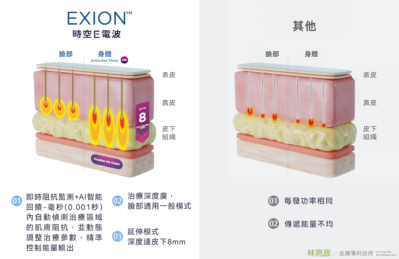 尤其痘疤族群會隨著年齡增長,皮膚鬆弛、組織結構流失,導致痘疤更明顯,時空E電波可以讓皮膚收緊、拉提並緊實,有助於整體視覺的皮膚質感提升。
