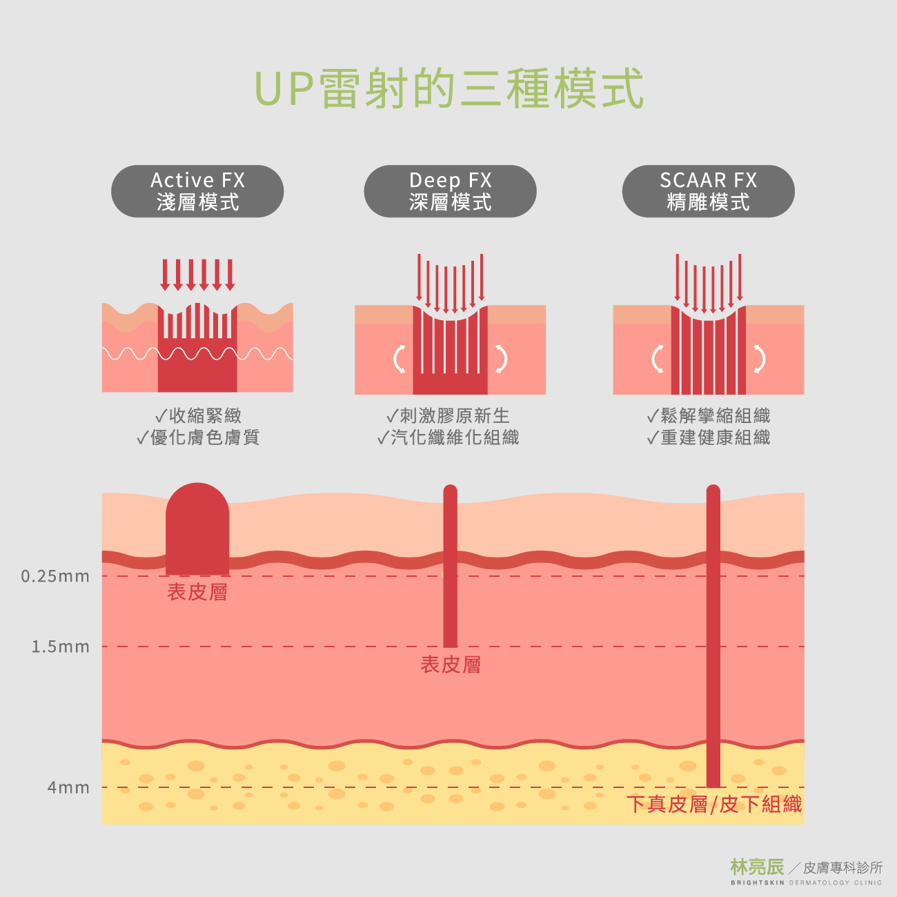 UP雷射可轉換三大模式–解決 (淺)膚質 (中)凹洞 (深)纖維化疤痕,再生健康組織。