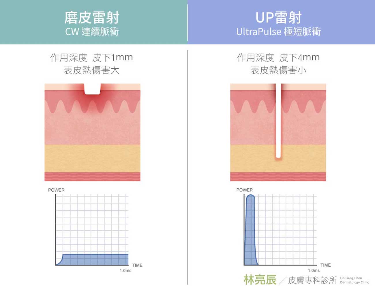 UP雷射的極短脈衝時間,可以在瞬間將能量深入近皮下4mm:突破傳統飛梭僅約1mm的治療深度,重點是能量精準俐落到深處、不拖泥帶水,熱傷害相較於傳統磨皮雷射(CW連續脈衝),能觸及痘疤「最根部」,更重要的是,得以:鬆解纖維化疤痕組織!