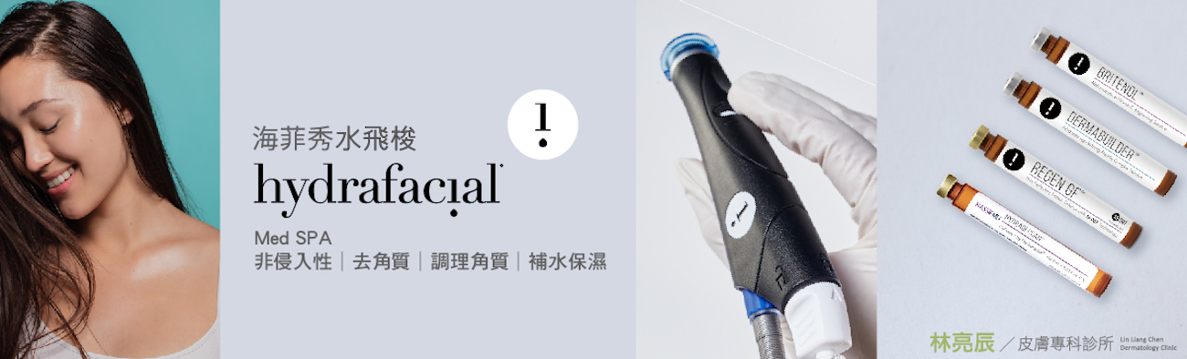 - 處理:林亮辰皮膚專科診所採用的是水飛梭鼻祖「海菲秀syndeo」,以水渦輪技術,螺旋刮片設計搭配負壓技術,清除老廢角質、帶出毛孔中的油脂、粉刺等外來物質,除了深度清潔髒污、溶解角栓、帶出粉刺,讓毛孔「暢通深呼吸」,還能夠搭配酸類煥膚,提升角質代謝效率。
