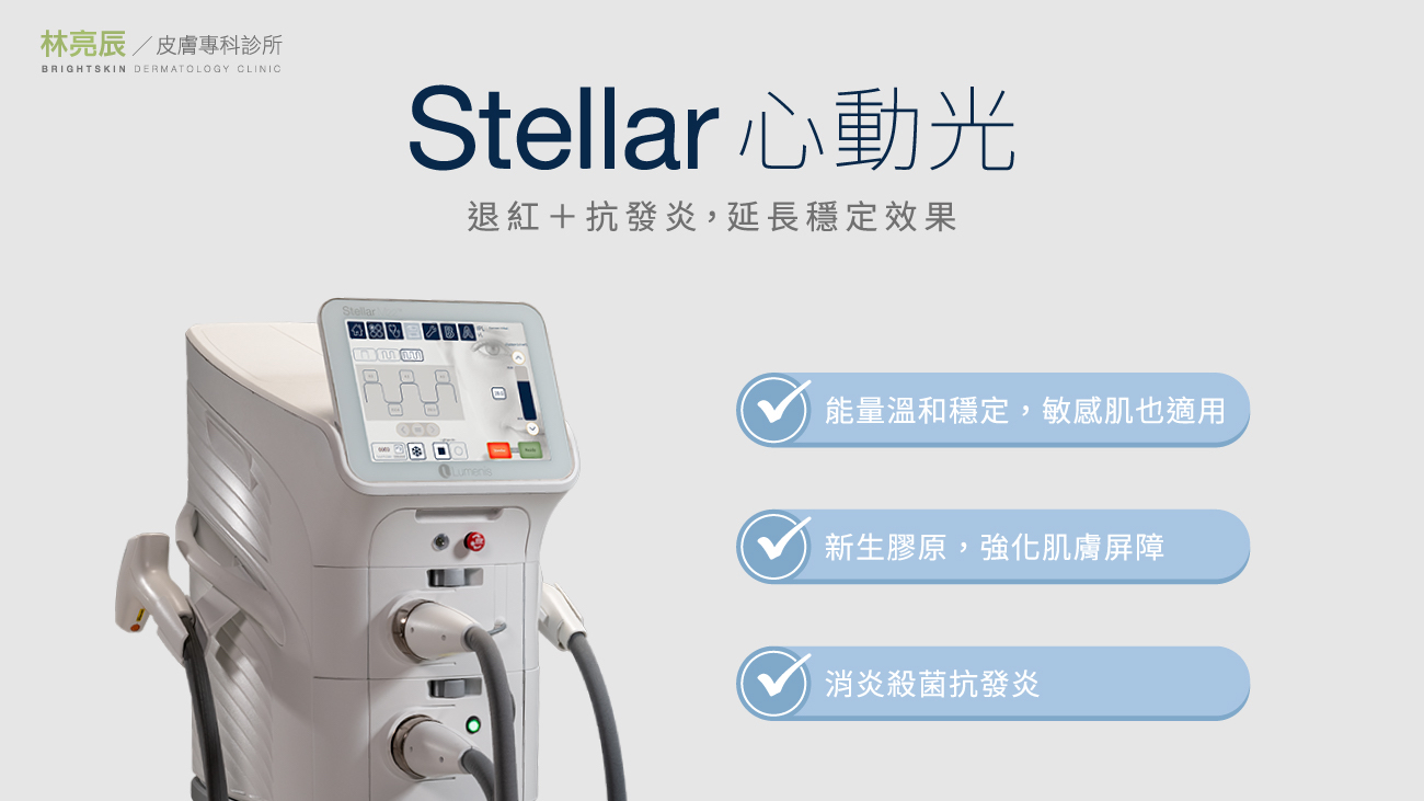 Stellar心動光針對痘痘膚質,主打雙波淨痘濾片,可結合藍光與紅光波段,藍光針對痘痘發炎快速處理、抗菌消炎,紅光可調控皮脂腺並調節油脂分泌。
