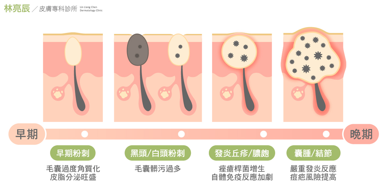 回歸到一個重點,痘痘通常是「油脂增加、角栓堵塞、發炎加劇」的連鎖反應,所以有效的痘痘治療,應該是要根據不同階段、在早期、中期、晚期有不同的對位處理,而不是僅著墨於單一症狀。