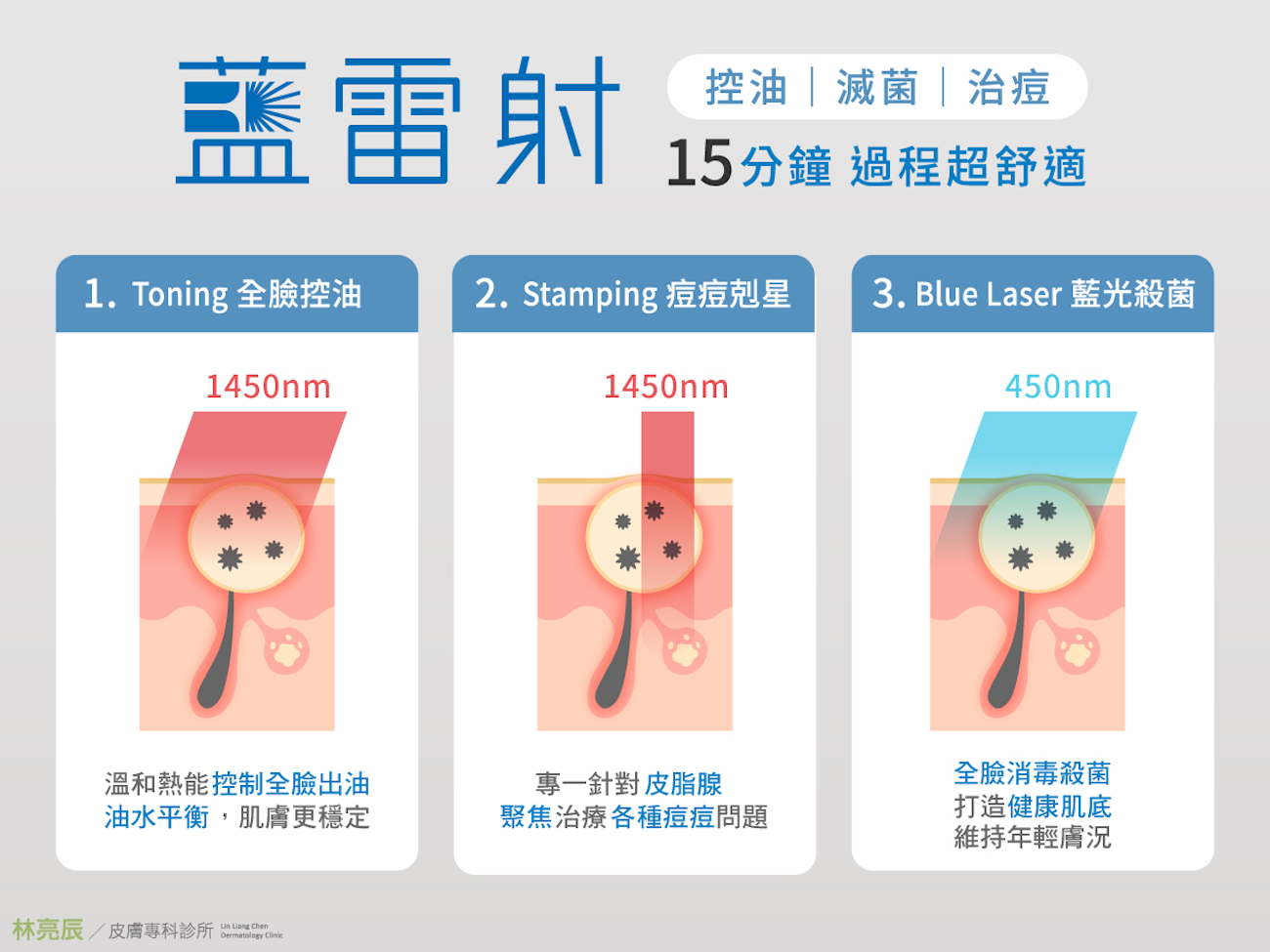 Step3. 最後運用450nm藍光,被痤瘡桿菌吸收產生自由基,達到滅菌效果,間接緩解發炎狀態。