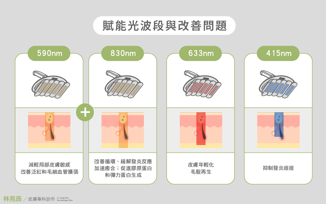 - 輔助:賦能光 Healite II (低能量光療)是痘痘療癒系好隊友,可以幫助降紅、降低炎症細胞活躍,可在療程後或爆痘期併行。在每一次林亮辰皮膚專科的青春痘光電門診後,皆可進行賦能光照射療程,可減緩痘痘腫脹感,無痛、無傷害性、無修復期的優勢,相當友善痘痘膚質。
