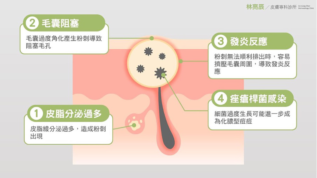 一但代謝速率異常,老廢角質無法正常排出,或因保養品、彩妝品的錯誤使用,不當清潔與環境因素,加上細菌滋生,便會形成內包粉刺(黑白頭粉刺)。這些看似靜態的粉刺,實際上卻是發炎性痘痘的預備狀態。