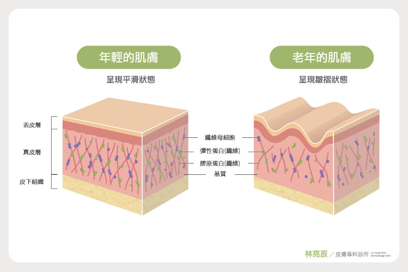 皮膚老化時,細胞外基質(ECM)主要發生以下改變:膠原蛋白斷裂、總量減少,彈力纖維異常堆積或減少,玻尿酸及蛋白聚醣含量下降,導致皮膚結構鬆弛、彈性降低、皺紋加深。這些變化會削弱纖維母細胞與ECM的機械連結,進而抑制膠原蛋白合成,促進MMPs(基質金屬蛋白酶)活性,造成進一步的ECM降解。