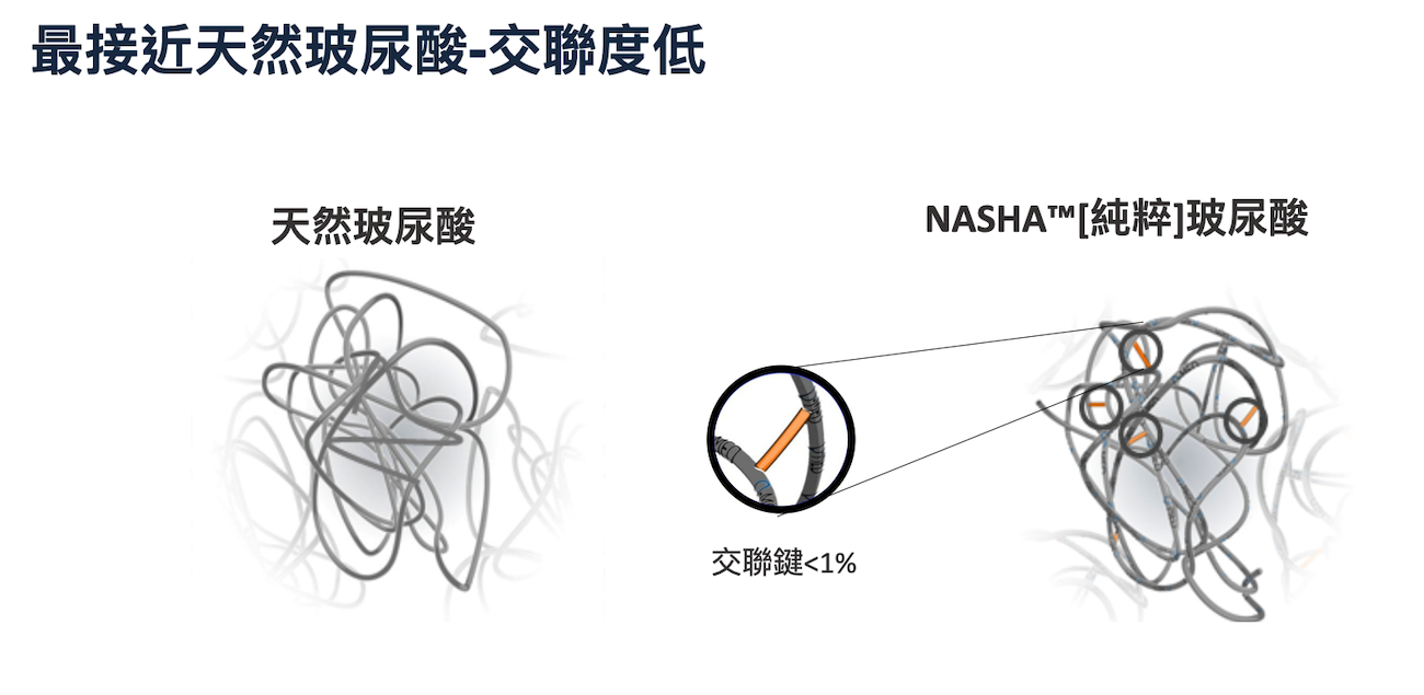 NASHA® 技術只進行極少量交聯處理,修飾度(MoD)低於 1%,讓玻尿酸鏈的天然立體網狀結構幾乎不被破壞。