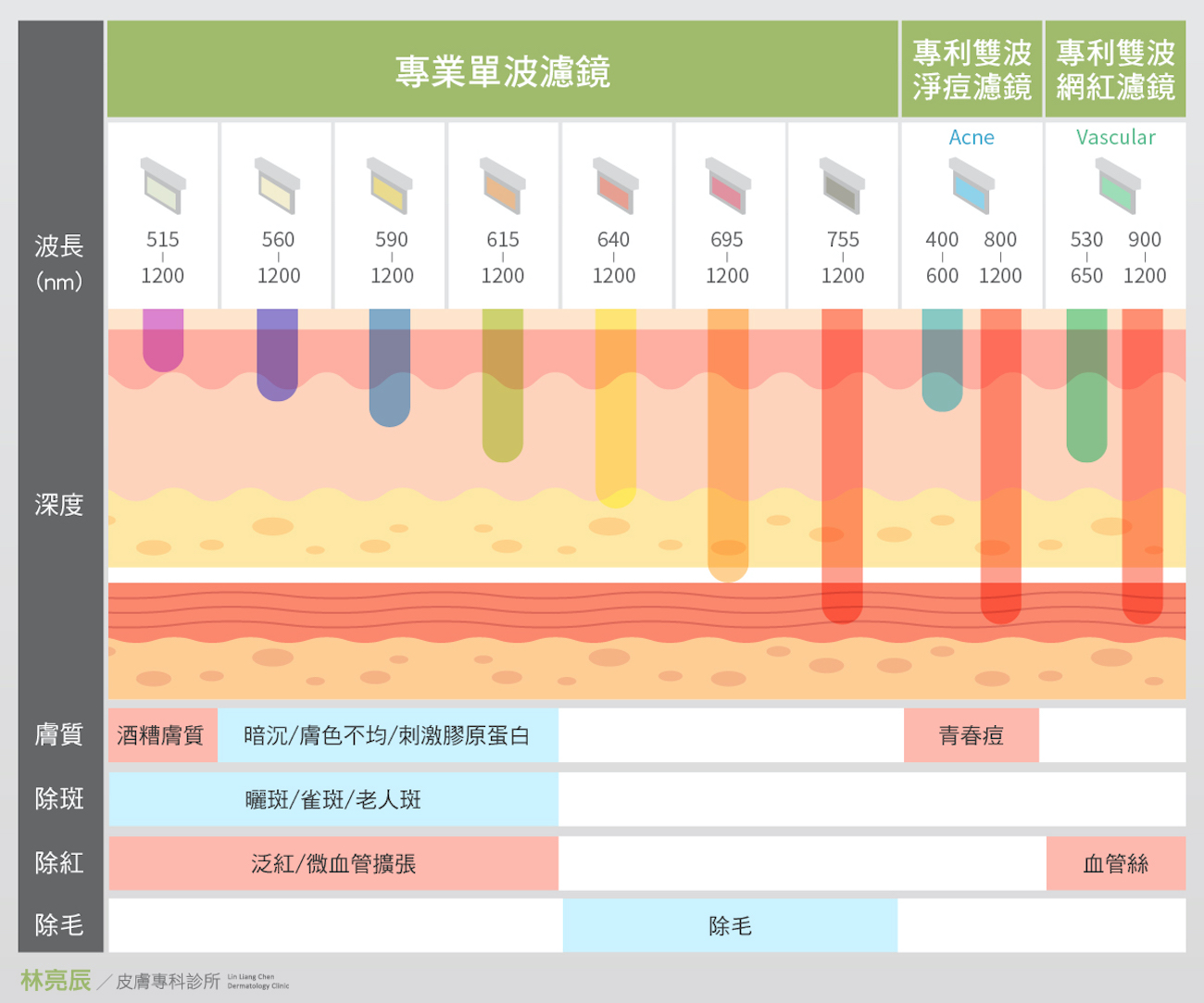 心動光搭載9種不同濾片,穩定分段輸出能量,改善皮膚各種問題,尤其可以抑制血管的擴張(減少皮膚泛紅的機率、改善紅色痘疤,有效改善敏感肌、酒槽肌與光老化造成的泛紅),同時刺激膠原蛋白再生,促進真皮層的細胞更新,角質層完整(排列更縝密)、皮膚更健康、強健。在規律的治療後,真皮層膠原增生、微血管收縮、角質層排列更緊密,皮膚變得: