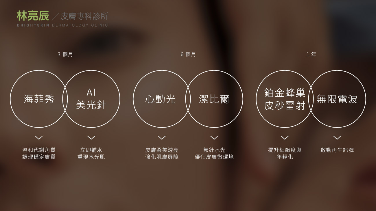 在林亮辰皮膚專科診所,我們始終強調的核心,就是 「整合式皮膚照護」。不單看一台儀器、一個療程,而是從肌膚狀態、生活作息、壓力、工作型態,到保養與治療安排,全部整合在一起。同時,我們也相信「醫病共管」,從理解每個人的生活型態、期待與期待,到排出能真正執行的計畫,再到每次追蹤、微調、確保膚況在倒數的這幾個月穩定前進。