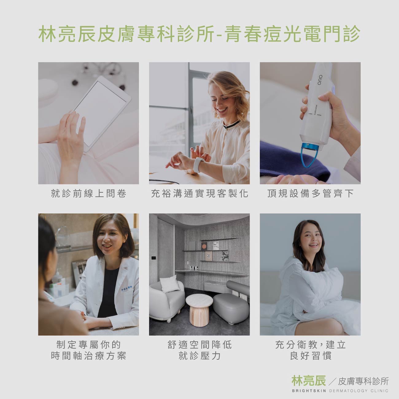 林亮辰皮膚專科診所青春痘光電特別門診,從評估、治療、保養與生活習慣一起著手。線上問卷先讓醫師在正式看診前掌握你的保養、飲食與過去治療史,進診後能直接切重點,省下反覆摸索的時間。門診安排充分,能把作息、壓力、預算納進同一張藍圖,與專家群一起排出「你的專屬治療時間軸」,把用藥、清粉刺、控油、退紅及修復整合成可持續的計畫。空間動線與隱私設計降低就醫壓力,提高依從性,也會同步協助你調整「致痘習慣」,從飲食、睡眠、底妝到卸妝,一次處理。這樣的四維整合(藥物 × 光電 × 保養 × 生活調整),讓反覆爆痘有機會真正離開軌道。