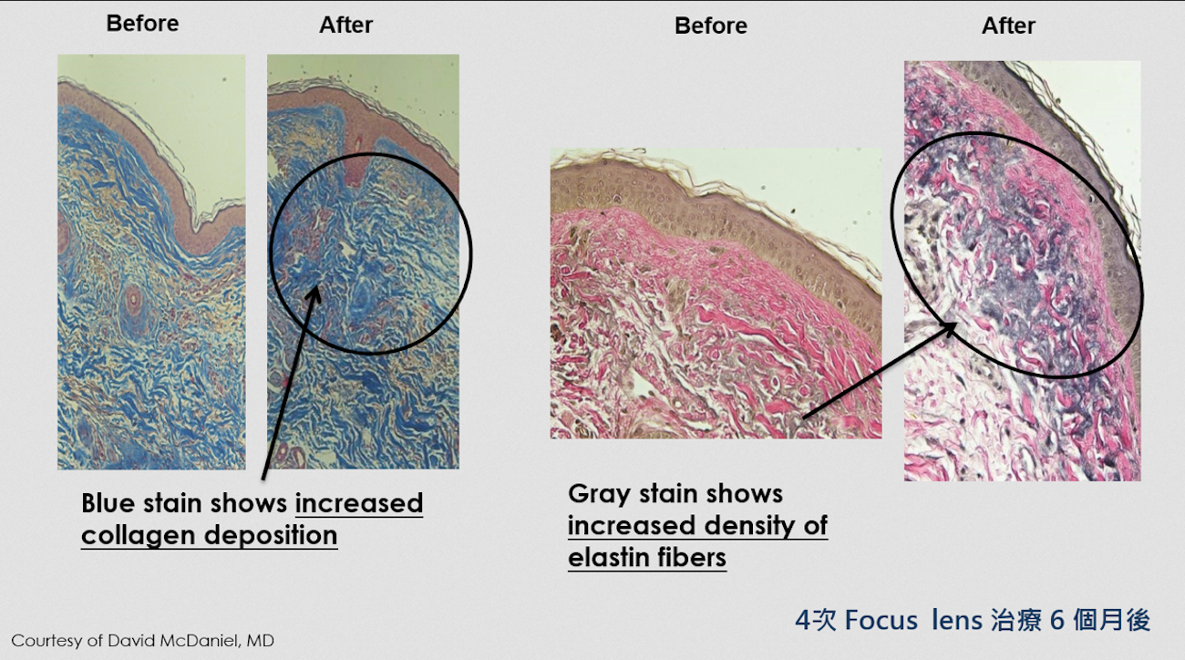 ▲觀察到鉑金蜂巢透鏡數次治療後膠原蛋白新生膚質更厚實,這也代表著在數次的治療之下,皮膚因膠原新生,進而達到更厚實、健康、年輕的狀態。
