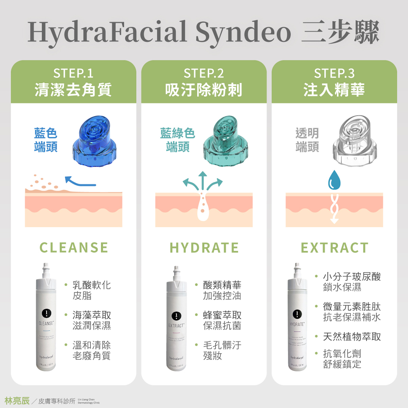 第二步驟,真空吸力可深入去除藏在毛孔內的粉刺、髒污、油脂、殘妝,再透過果酸或水楊酸軟化皮脂;第三步依據膚況,挑選適合的精華液(使用處方)。透過探頭雙向引流技術,渦漩注入保養精華液,給肌膚充足水分及養分,保濕、修護之餘,使肌膚油水平衡,達到抗痘、防老化等效果。