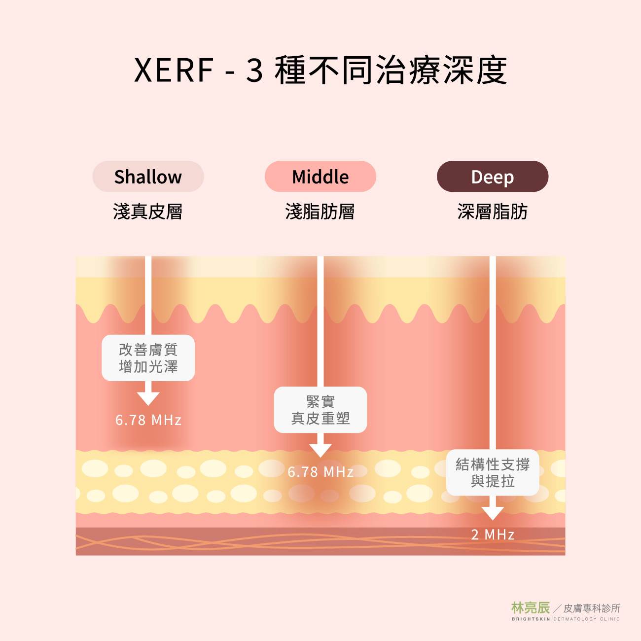 XERF透過雙頻設計,將能量精準劃分為三個層次(Shallow / Middle / Deep),讓治療能在較合適的輸出功率下,達到預期的組織深度: