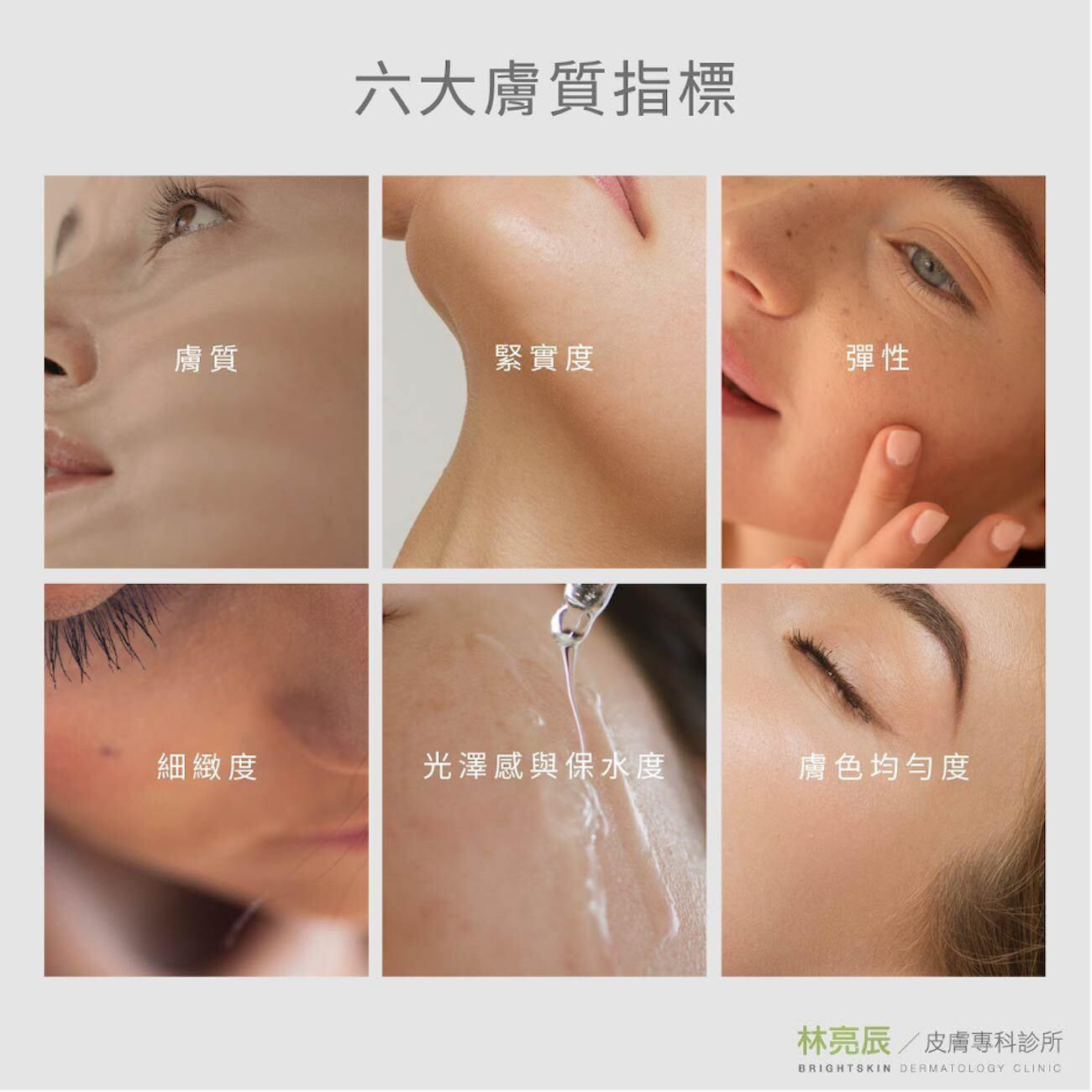 在林亮辰皮膚專科診所,我們追求的更宏觀、全面的皮膚健康,依據的是這六大指標:1.膚色、2.膚色均勻程度、3.細緻度、4.光澤感與保水度、5.彈性、6.緊實度。