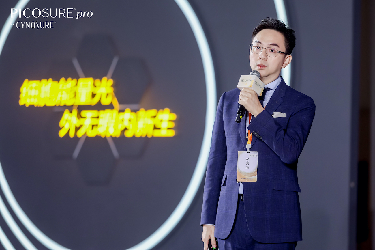 ▲林亮辰醫師受邀參與 2023年11月「鉑金皮秒雷射台灣上市發表盛會」。作為原廠臨床顧問與講師之一,林亮辰醫師分享鉑金蜂巢皮秒雷射在真皮層年輕健康化、色素穩定與膚質優化中的臨床應用,深入解析755nm波長與鉑金蜂巢透鏡對不同膚況的參數調整邏輯。
