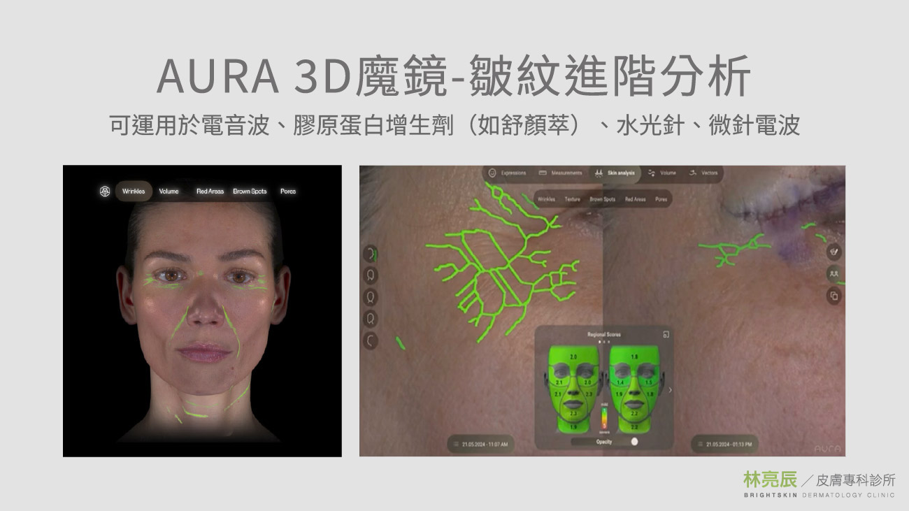 ▲歐若拉 3D 魔鏡 結合 AI 智慧運算,針對皺紋、毛孔、泛紅等五大維度進行量化分析,讓醫師與求美者站在客觀的數據上,聚焦溝通。